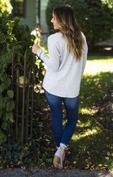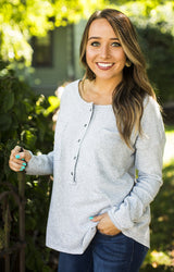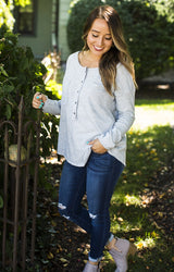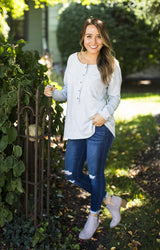 Pair this round neck henley with dark skinnies or layer it up with a cardigan or light jacket!
